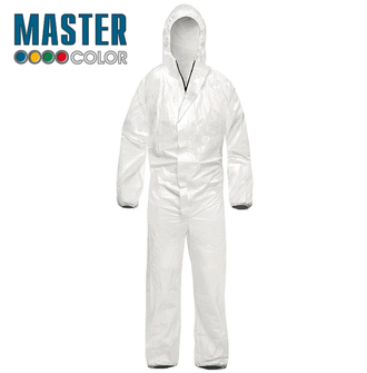 Комбинезон Master Color для малярных работ, цвет белый, с капюшоном. Изготовлен из 100% полипропилена «cпанбонд» (плотность 55 г/кв. м²) – нетканого безворсового материала. Нетоксичен, не вызывает аллергических реакций, антистатичен, имеет хорошую воздухопроницаемость одновременно с пылезащитными свойствами. Разрешен к применению в медицине, фармацевтической и пищевой промышленности. Данный вид производственных костюмов относится к категории комбинезонов и представляет собой идеальную одежду для работников, занятых в пищевой, фармацевтической, медицинской, мебельной и некоторых других видах промышленности. Кроме того, комбинезон незаменим в сфере косметологии, в процессе профессиональной уборки помещения, при проведении строительных (отлично защищает кожу при работе со стекловатой), малярных, штукатурных и лакокрасочных работ. Производитель - MASTER COLOR, Штрихкод - 4630031753239