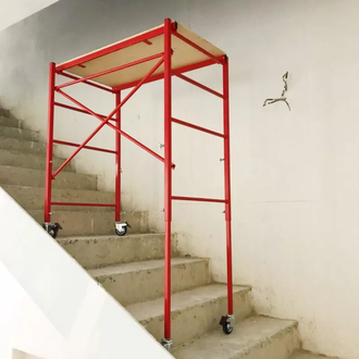Данные подмостки удобны при окраске на лестничкой площадке благодаря свойствам регулировки высоты и стопоров колёс.